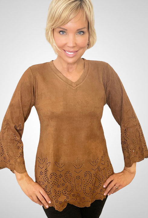 LASER CUT SUEDE PULLOVER TUNIC. NECTAR BROWN