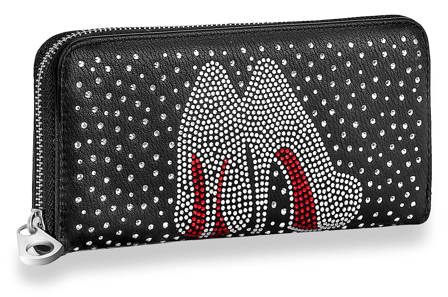 A classic accordion wallet goes glam with this design. Sparkling bling high heels and their famous red bottom.