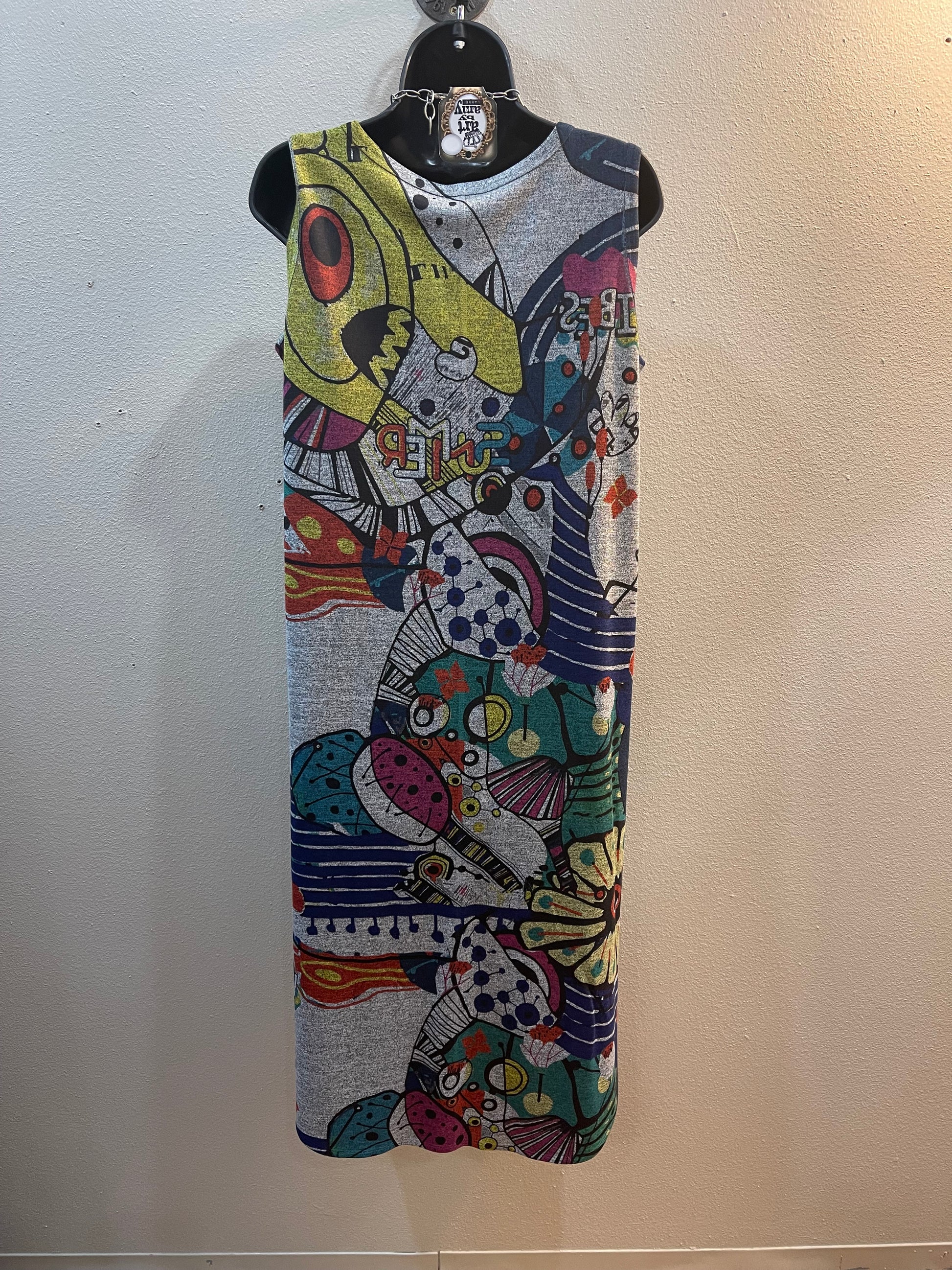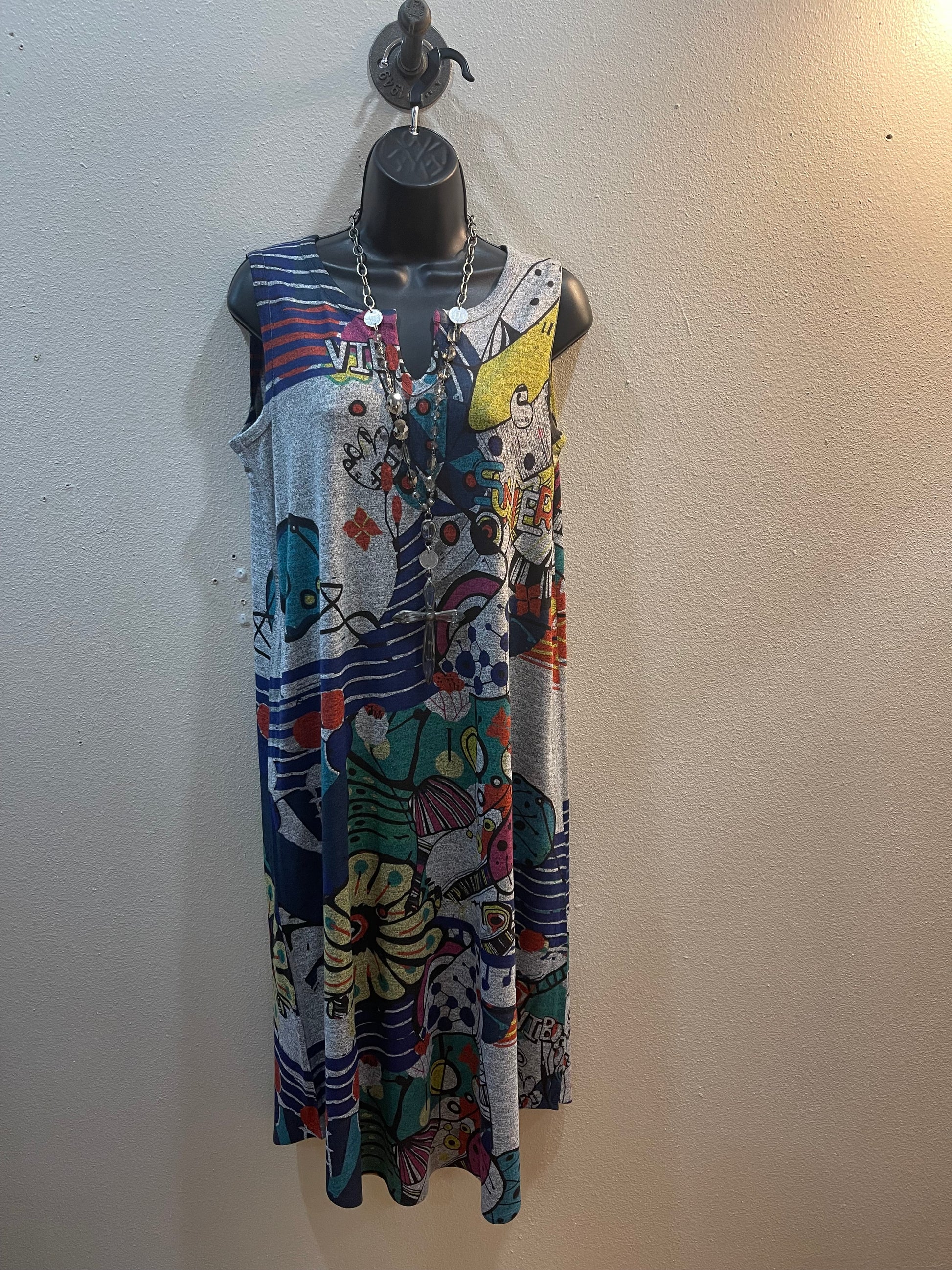 INOAH - DESIGNED AND PRINTED IN THE USA. WHIMSICAL & WONDERFUL COLLECTION OF TOPS, TUNICS, PANTS AND DRESSES. THIS SLEEVELESS DRESS FEATURES A V-PLACKET NECKLINE, LONGER MIDI LENGHT AND HAS TWO SIDE POCKETS. SOFT STRETCHY HEATHER GRAY KNIT IN A FUN "SUMMER VIBES" GRAPHIC.