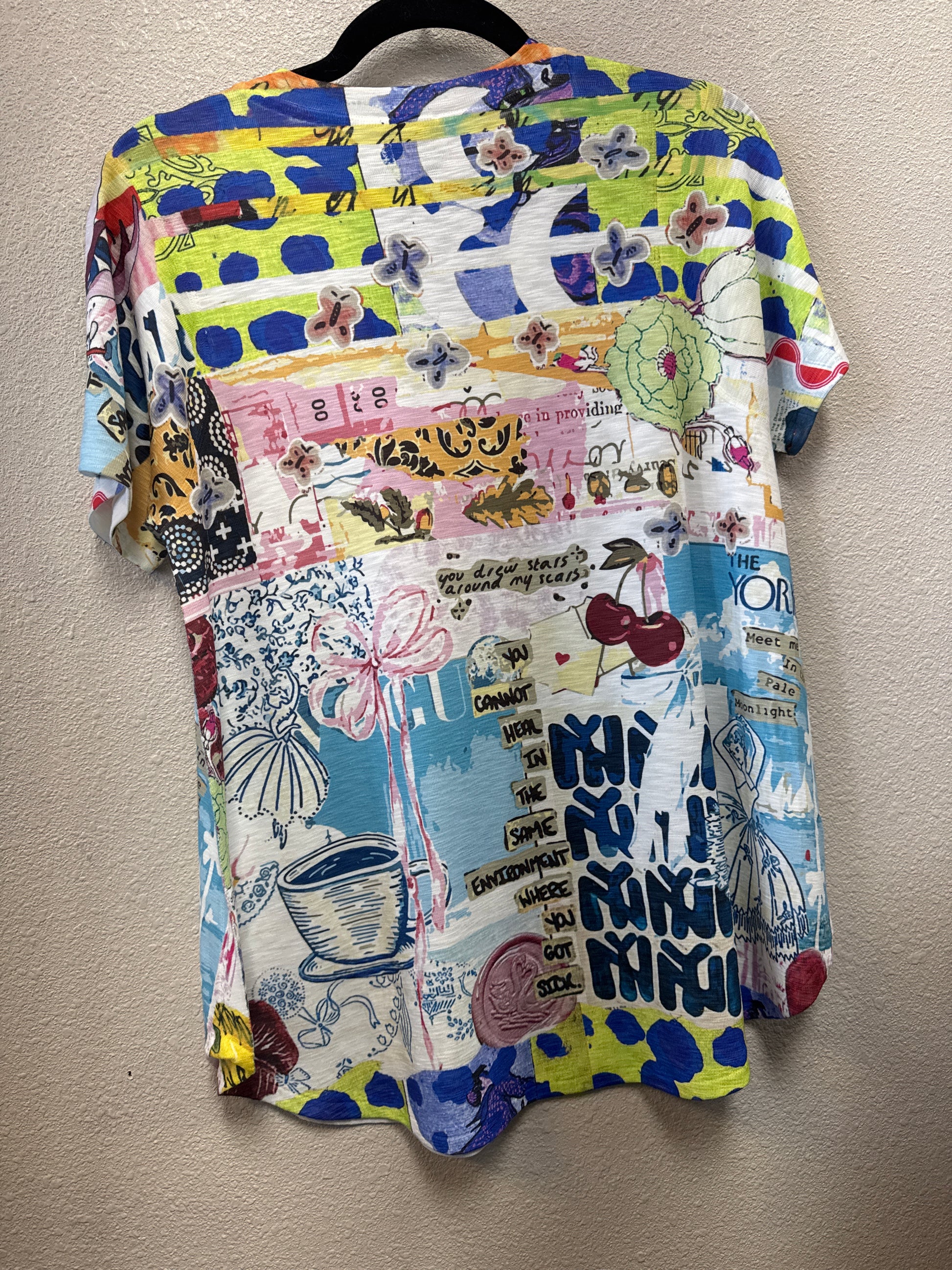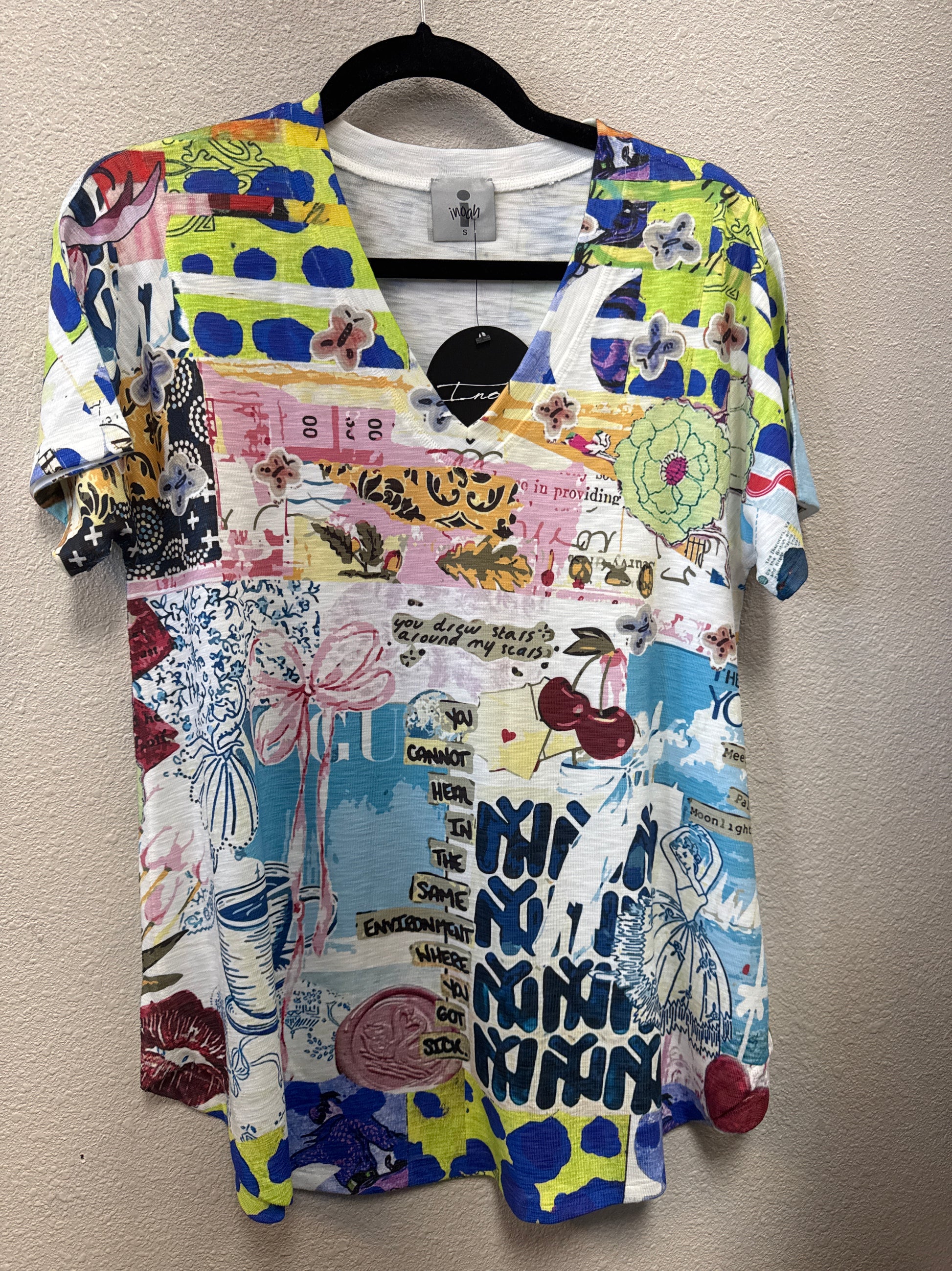 Inoah - designed and printed in the USA, whimsical, & wonderful collection of tops, tunics & dresses! This top features a finished V-neck, short sleeves and loose A-line fit with a slight rounded hem. Made from a soft nubby knit in a beautiful colorful print, "TEA & JOURNAL" will be your favorite "go-to" top with your favorite skirt, skort, shorts, jeans, or leggings. Love it!