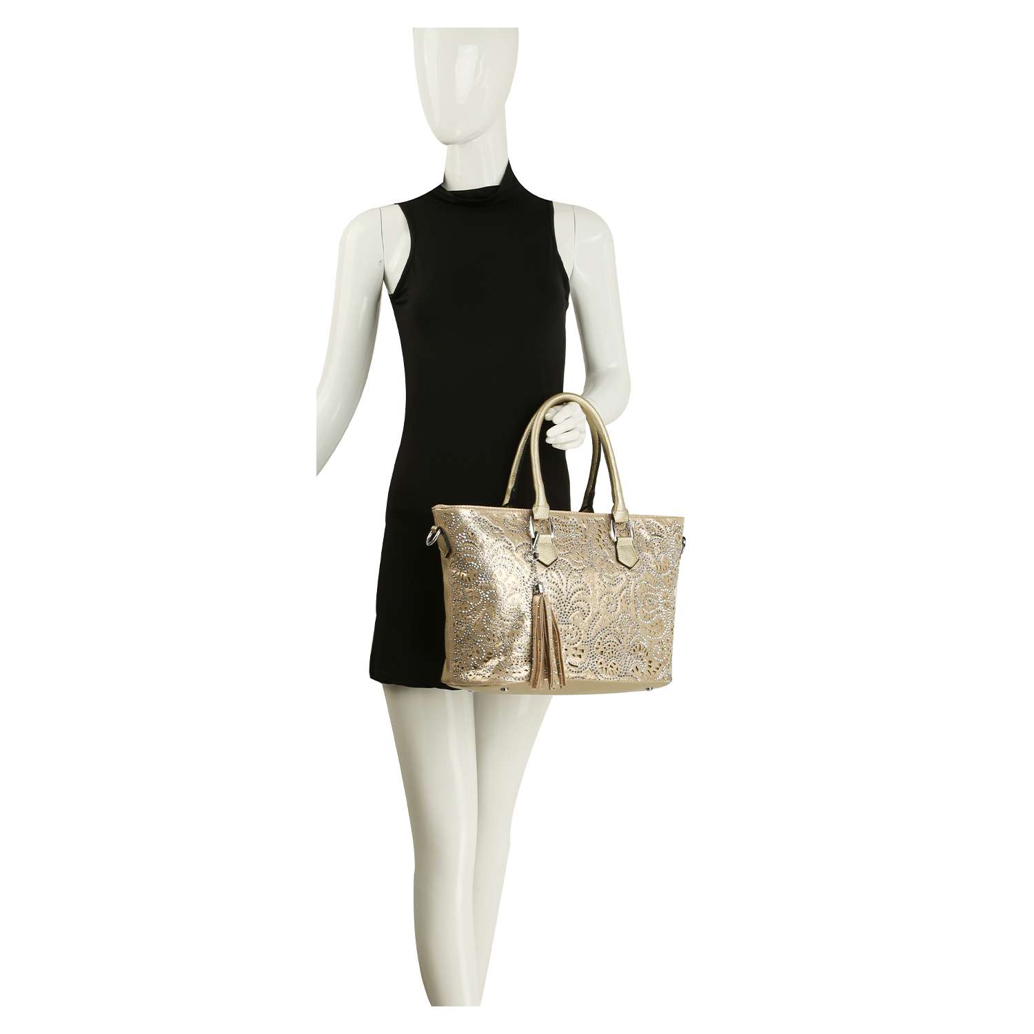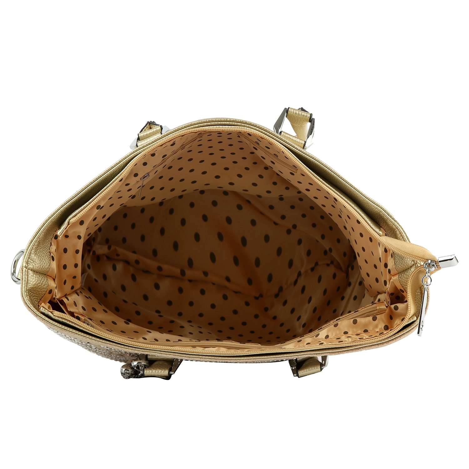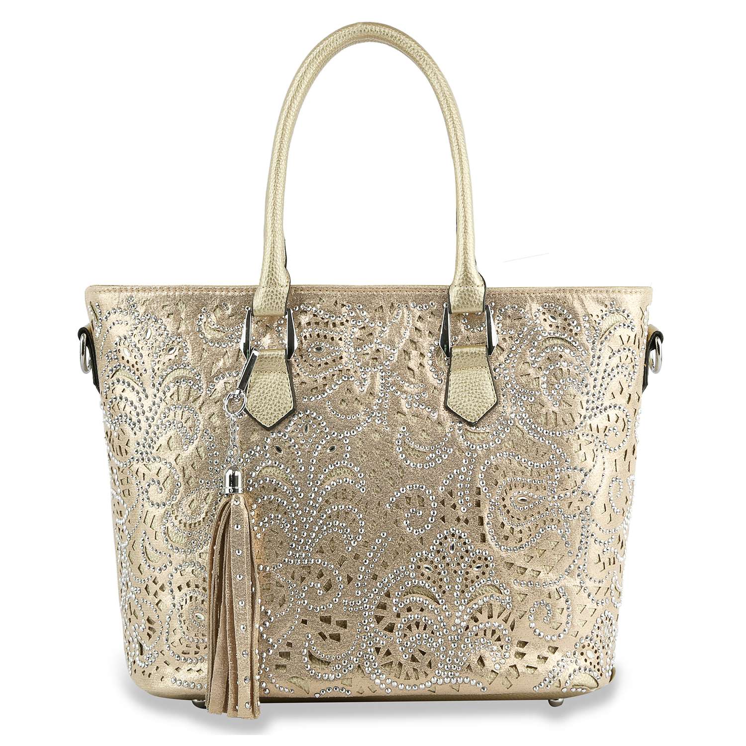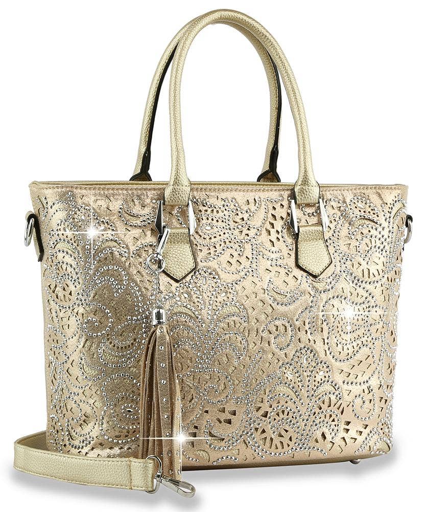 Shimmering rhinestones bring eye-catching allure to this layered tote.