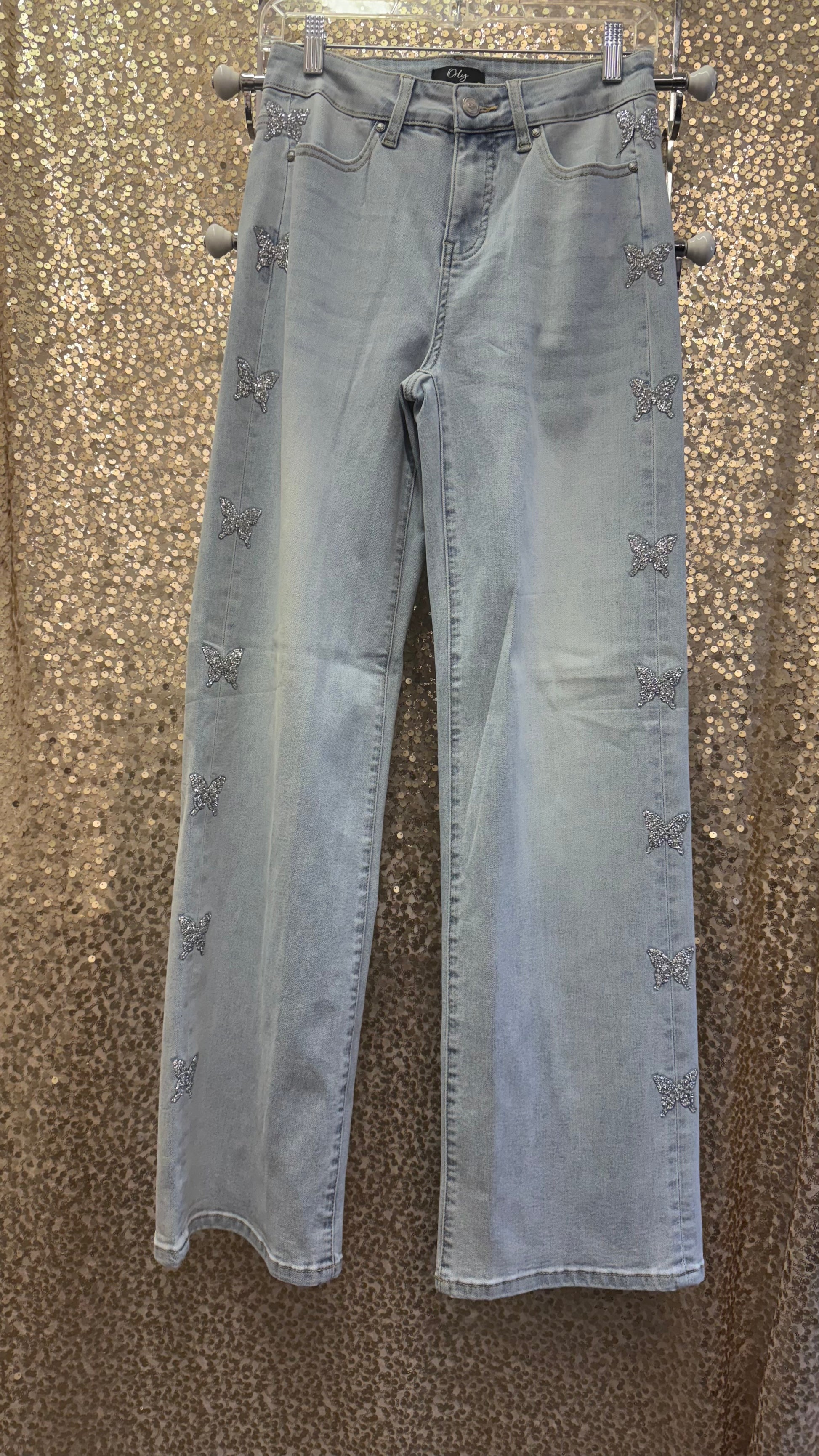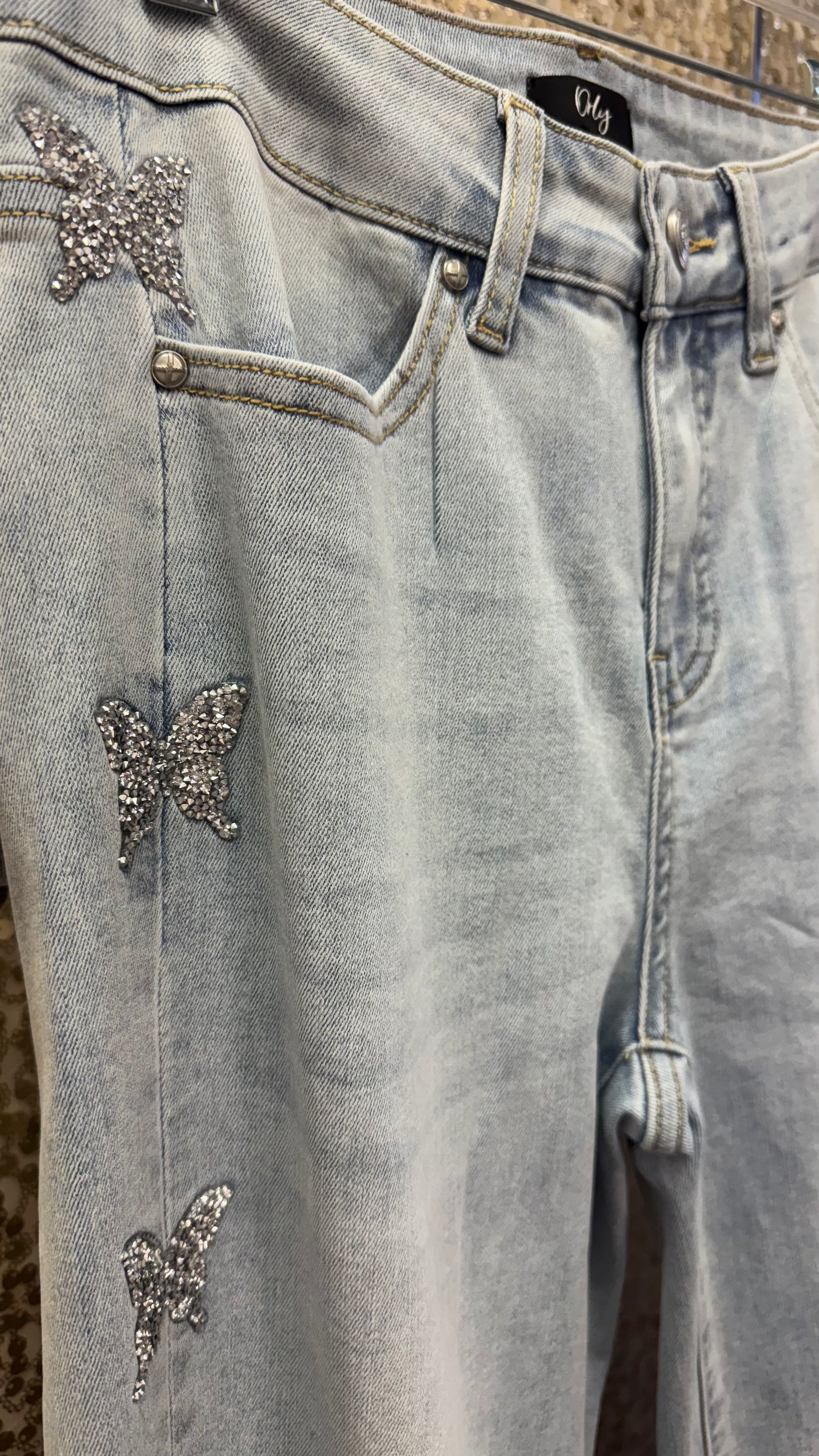 ORLY LIGHT DENIM PANT W/SEQUIN BUTTERFLIES DOWN SIDE