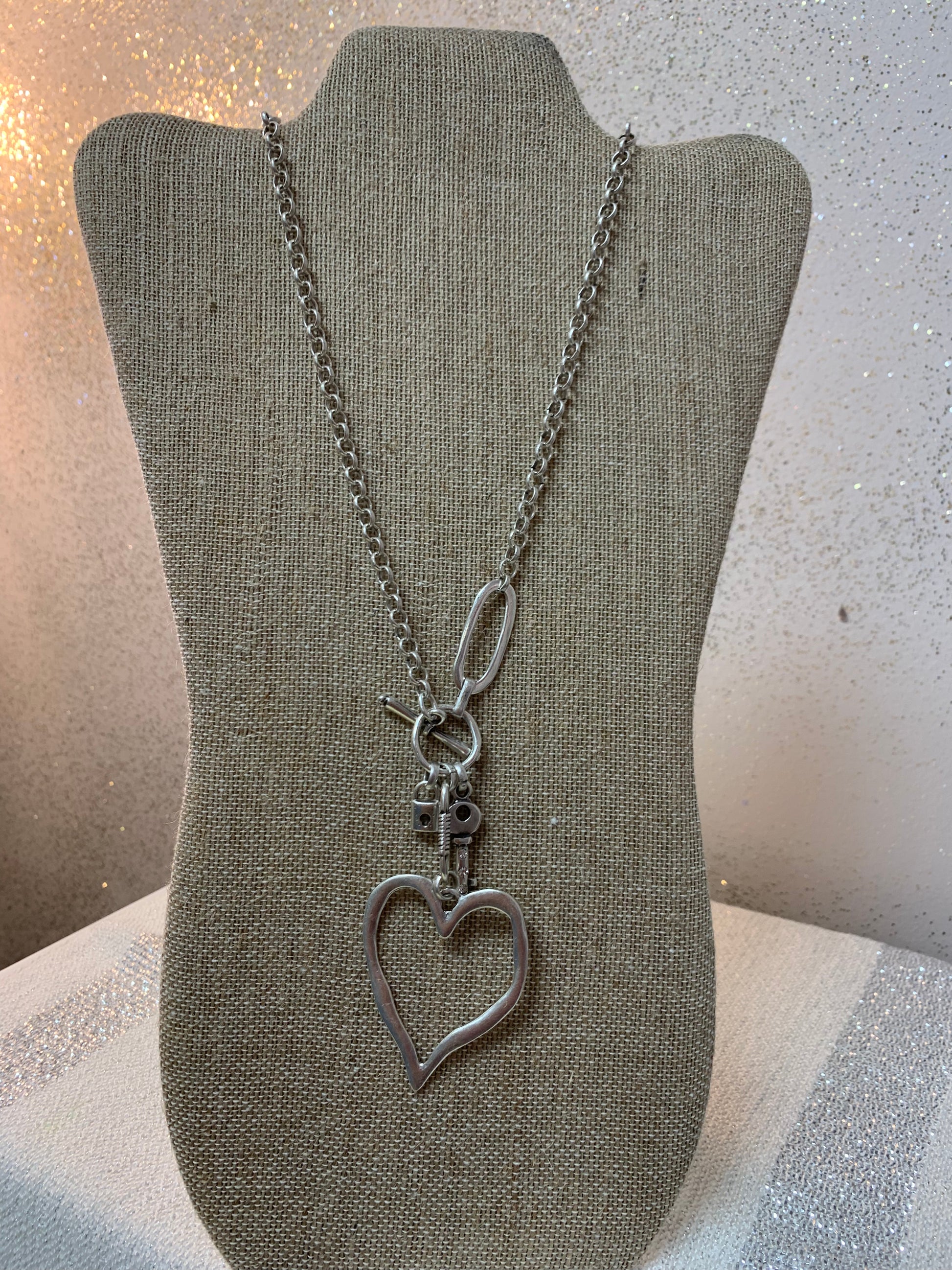 PEWTER LONG OPEN HEART & CHARMS NECKLACE