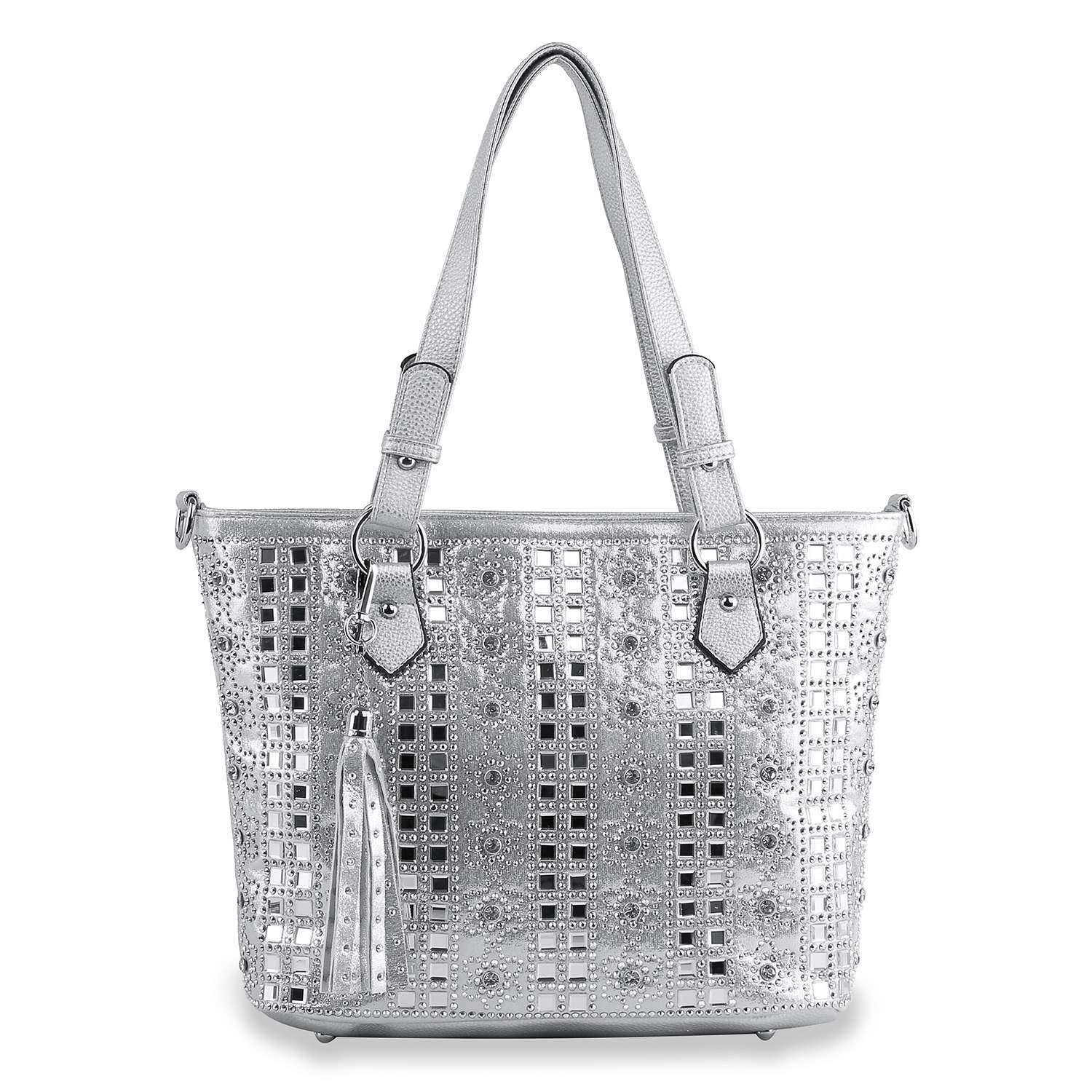 Featuring an intricate rhinestone pattern exterior, this handbag is beyond your average tote. Wear on your shoulder or go hands free with an optional crossbody strap. This chic tote is your stylish answer to work or weekend.