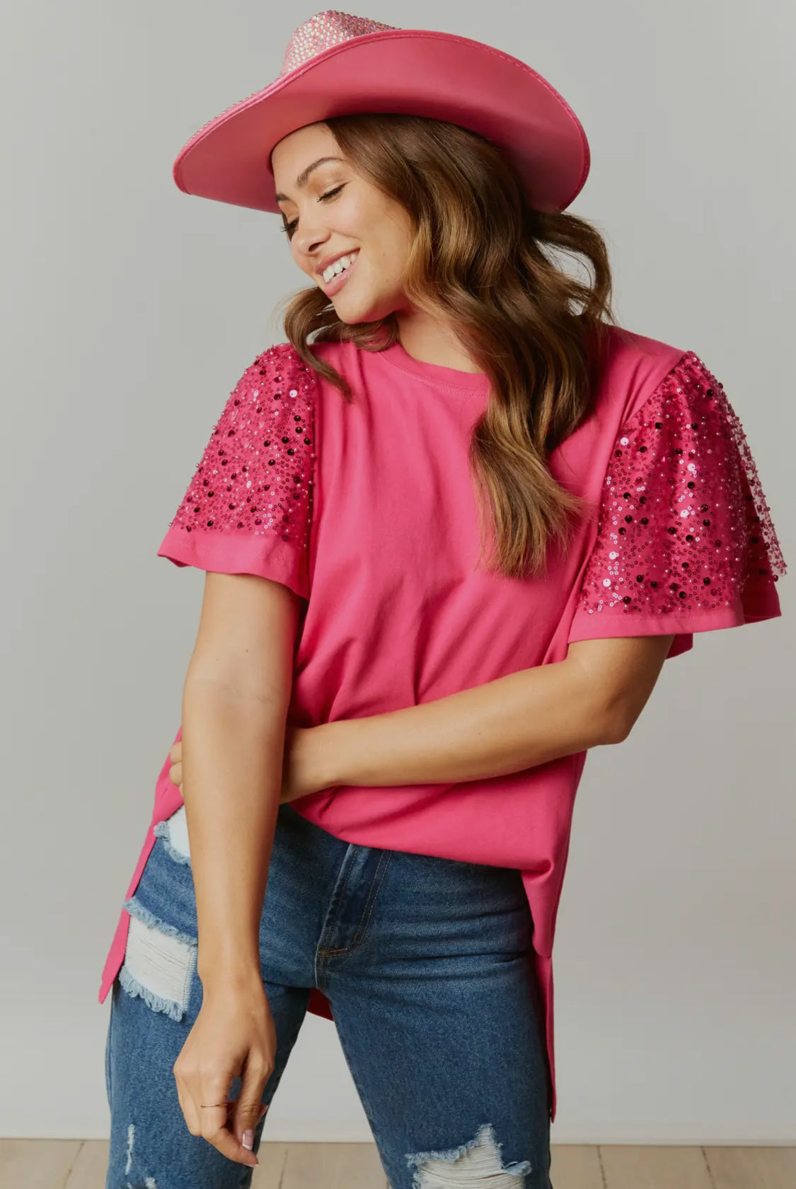 SEQUIN SLEEVE KNIT TEE. ROUND NECKLINE, SHORT FLUTTER SLEEVE, HIGH LOW SIDE SLIT.