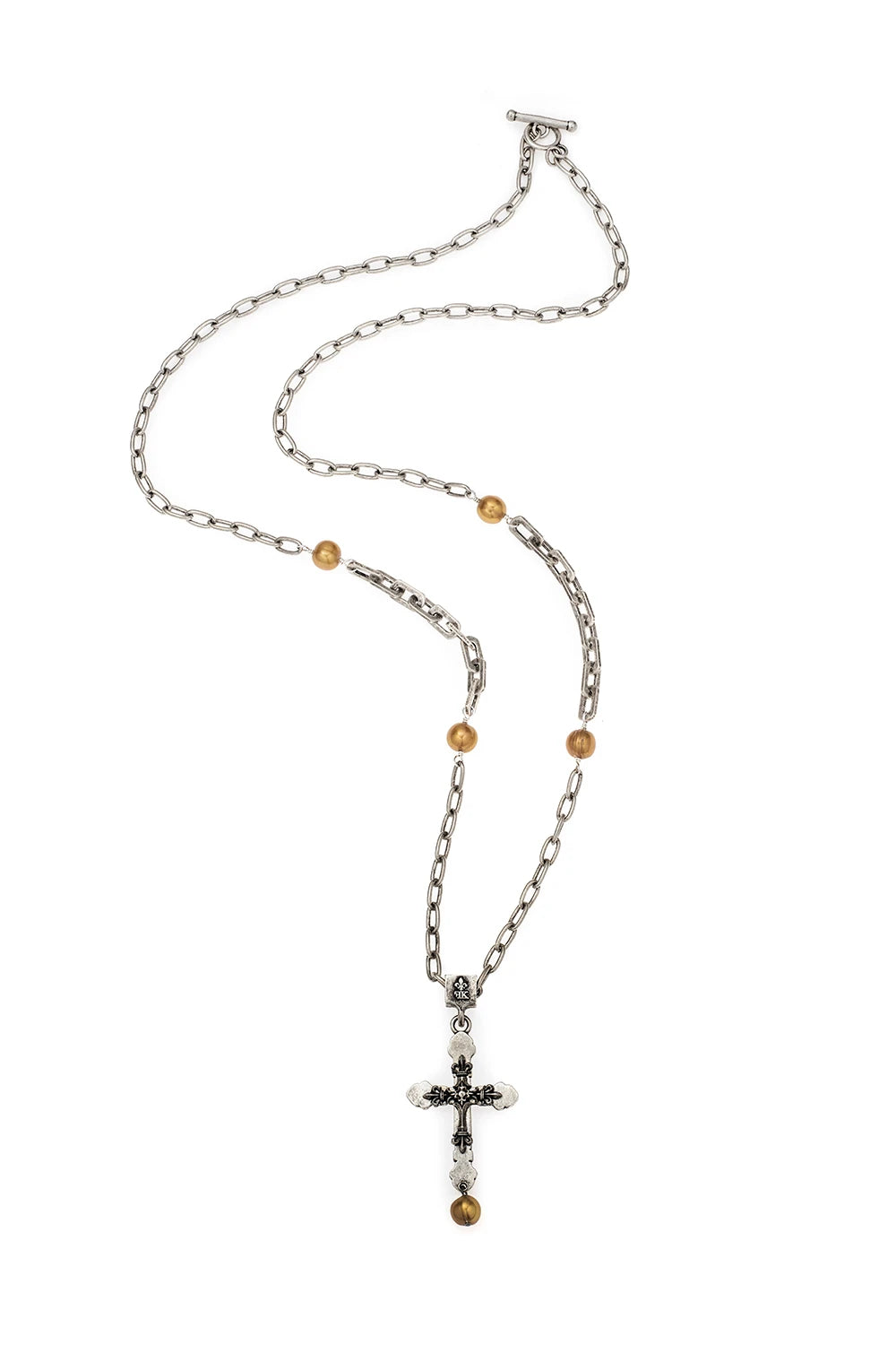 CT2059-Z SILVER CLAD/GOLD PEARLS; 38" SILVER OX ELONGATED SINGLE CABLE CHAIN, GOLD FRESHWATER PEARL ACCENTS, SQUARE BAIL AND DOUBLE CROSS.