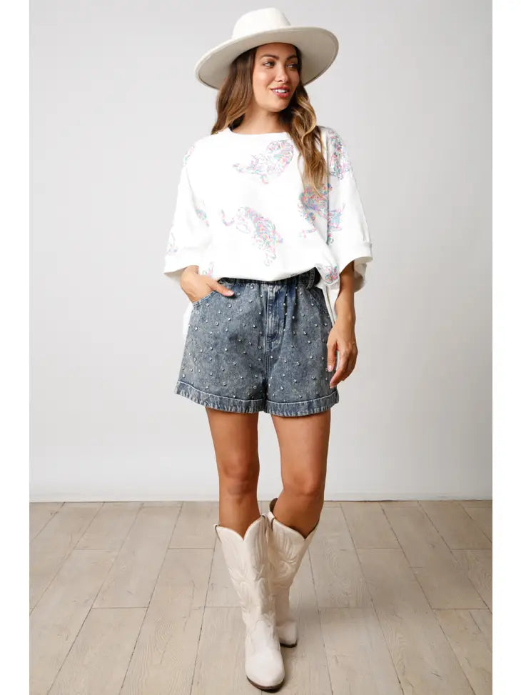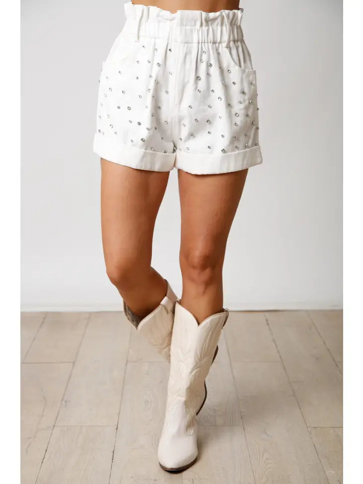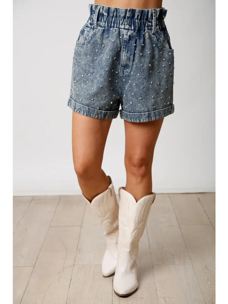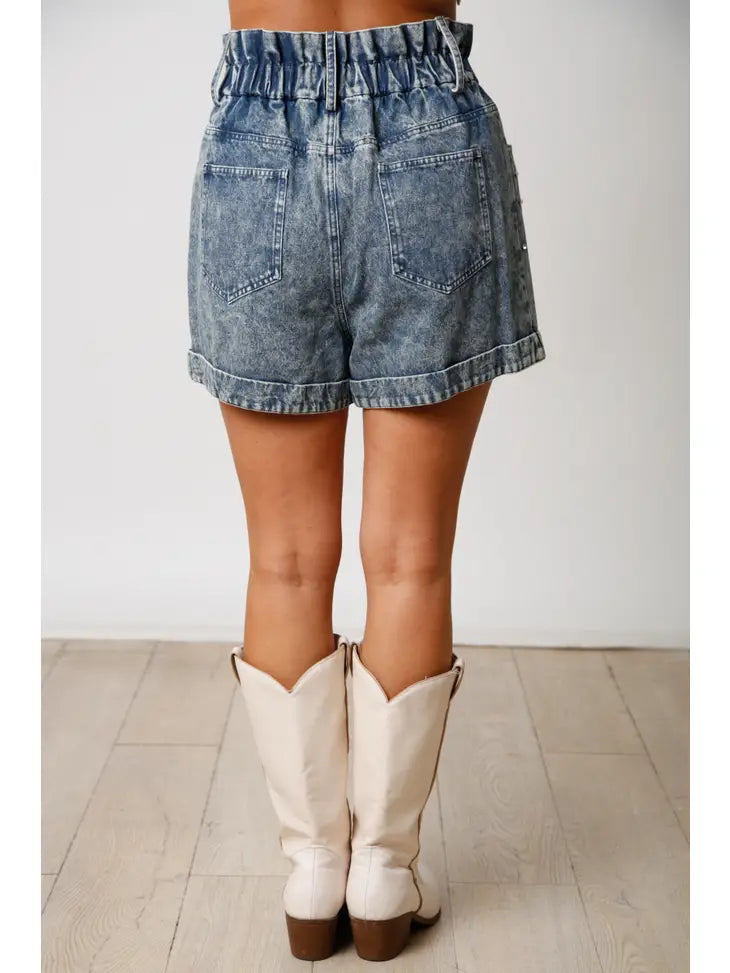 RHINESTONE STUDDED WASHED DENIM PAPER BAG SHORTS.