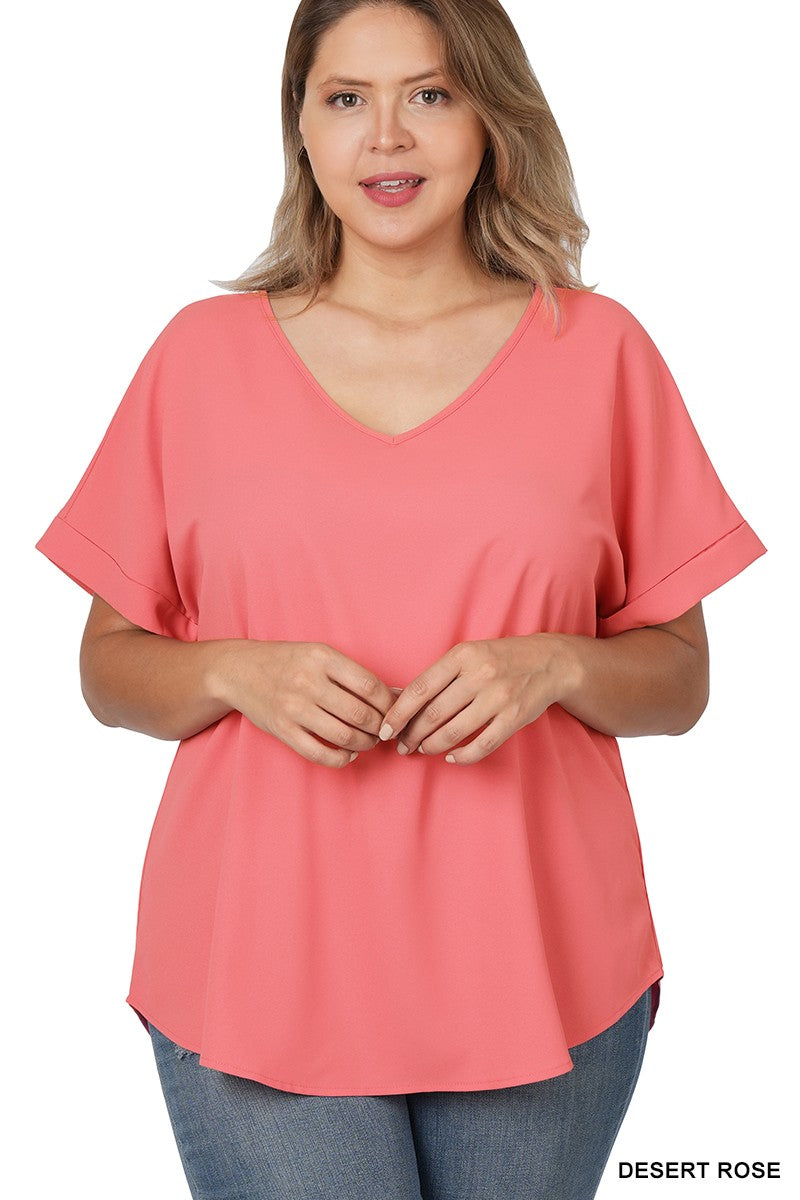 WOVEN ROLLED SLEEVE V-NECK TOP