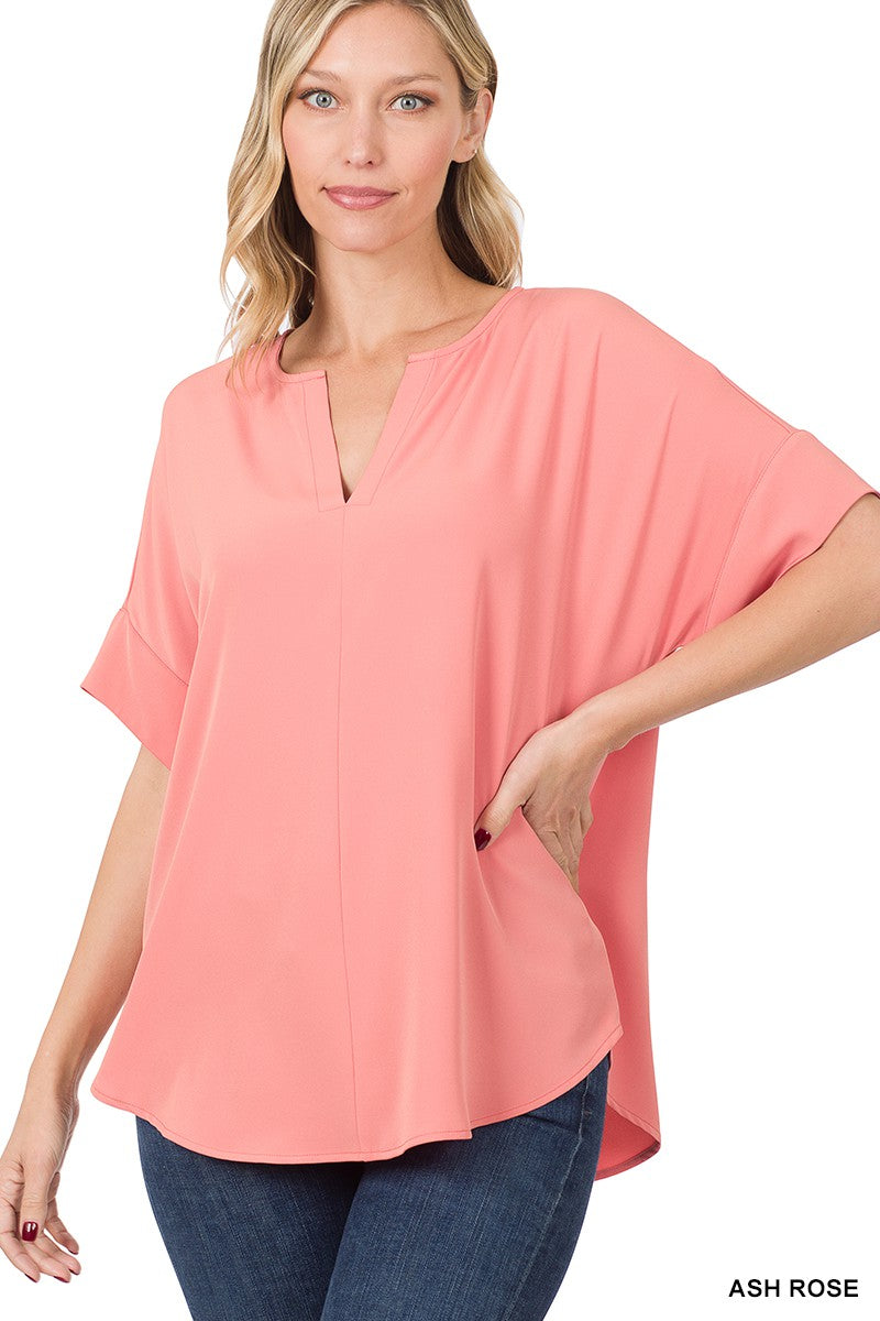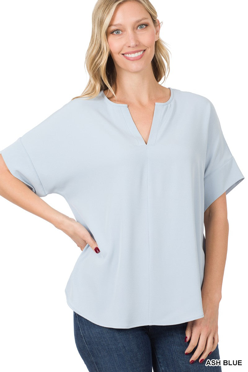 WOVEN SPLIT NECK SHORT SLEEVE TOP